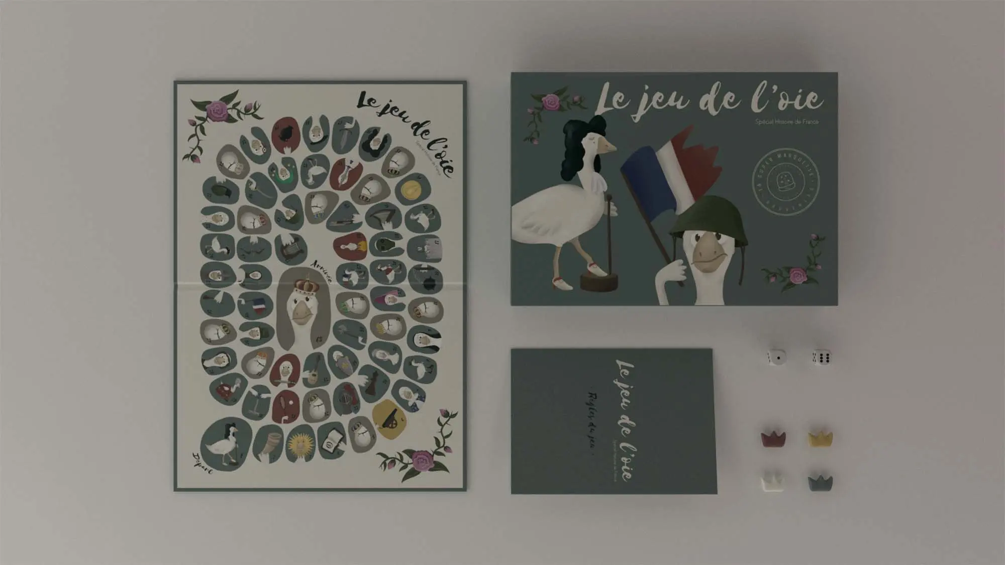 La Super Marquette was a french souvenir store containing made in France products. The goal of this school project was to create a Game of the Goose (a popular french board game) for this store inspired by a french topic. The chosen topic was the history of France, a rich topic with multiple references and characters to illustrate.
